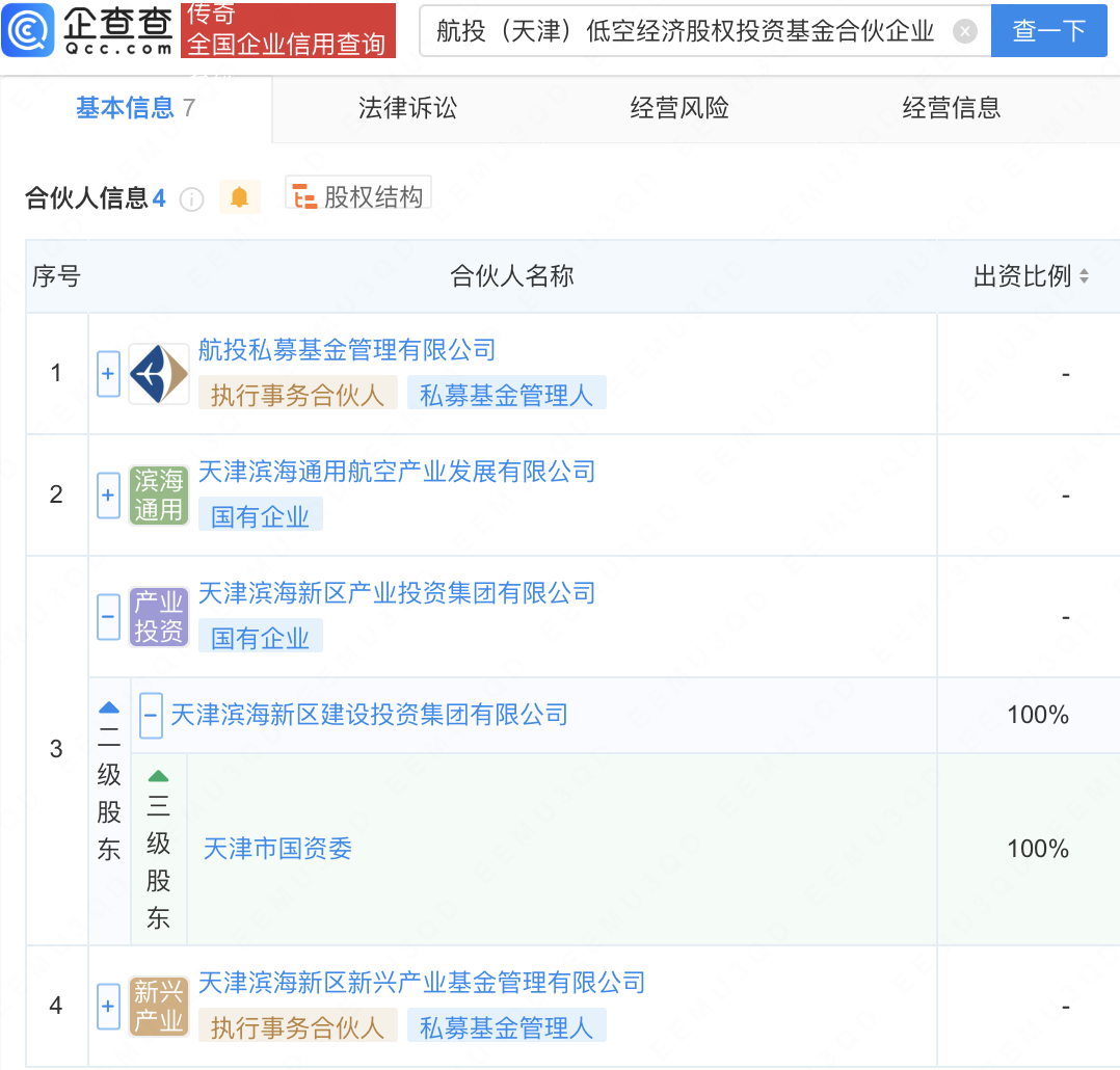 近日线下股票配资,航投(天津)低空经济股权投资基金合伙企业(有限合伙)成立,出资额1亿元,经营范围包含:以私募基金从事股权投资、投资管理、资产管理等活动。企查查股权穿透显示,该企业由航投私募基金管理有限公司、天津滨海通用航空产业发展有限公司、天津滨海新区产业投资集团有限公司等共同出资。
